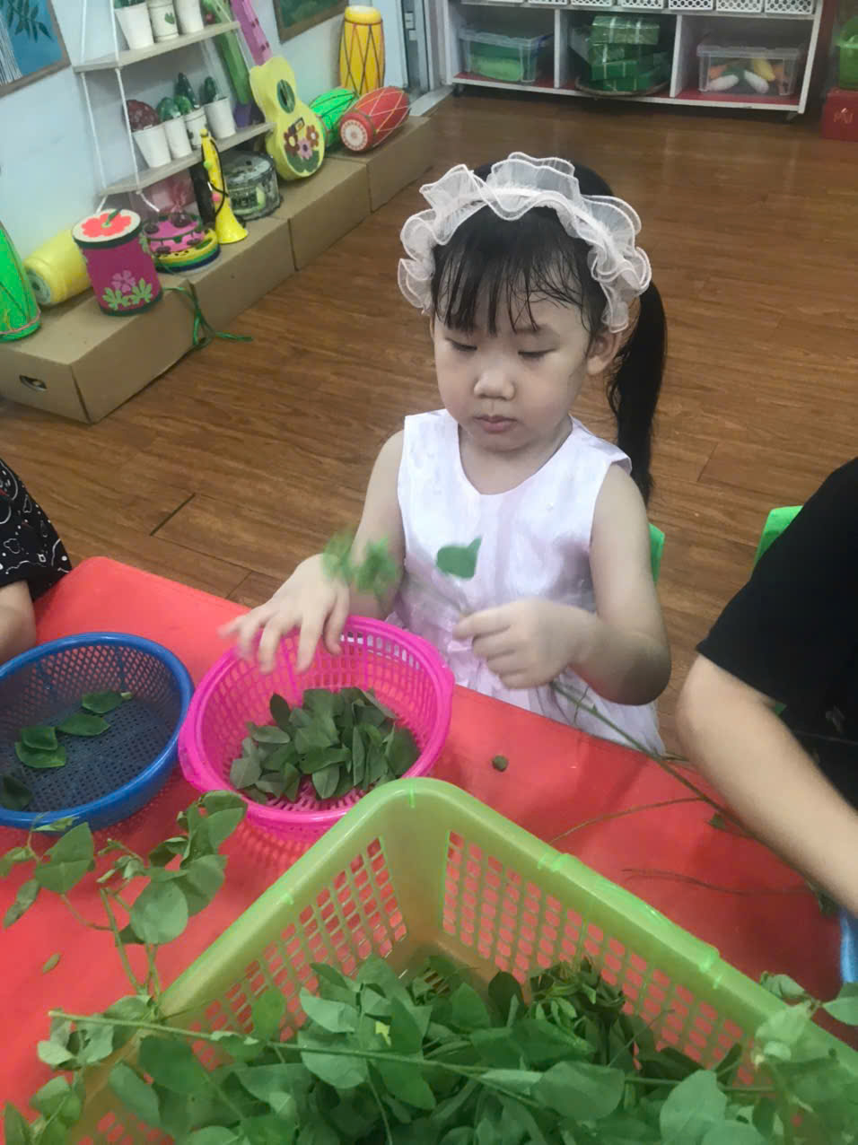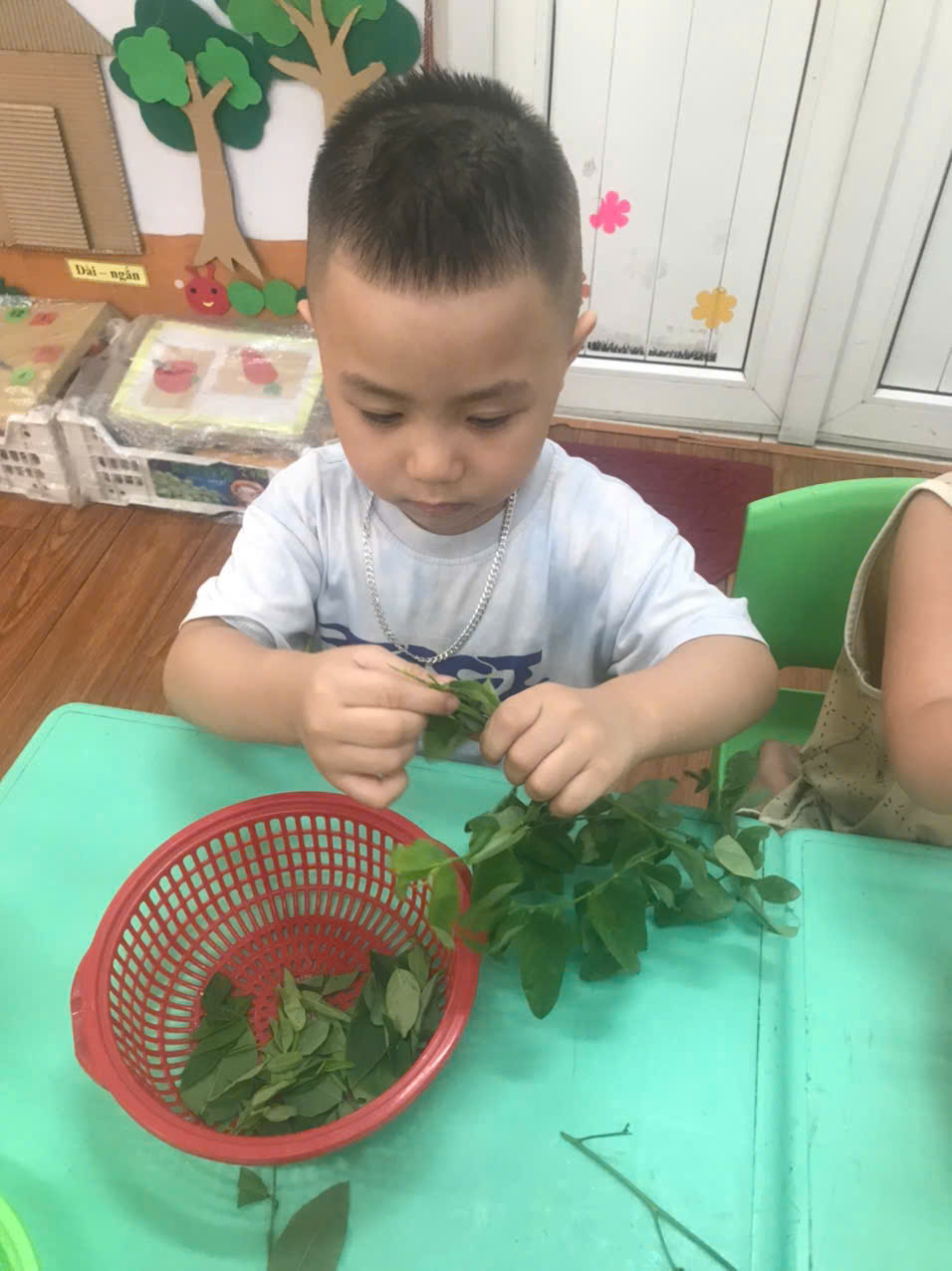 Những đôi bàn tay nhỏ xíu nhưng lại rất nhanh nhẹn và khéo léo! Bé nào cũng chăm chú nhặt rau, phân biệt lá non – lá già, làm việc không khác gì “các cô nội trợ nhí” chính hiệu. 😊