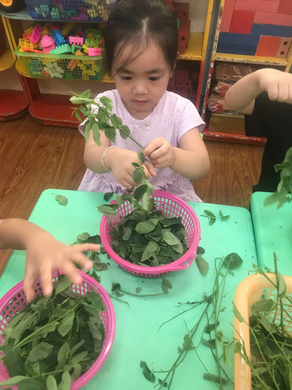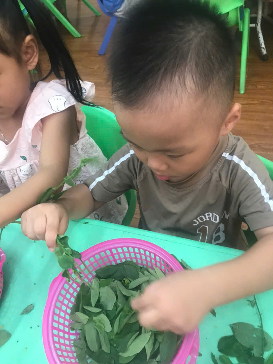Những đôi bàn tay nhỏ xíu nhưng lại rất nhanh nhẹn và khéo léo! Bé nào cũng chăm chú nhặt rau, phân biệt lá non – lá già, làm việc không khác gì “các cô nội trợ nhí” chính hiệu. 😊
